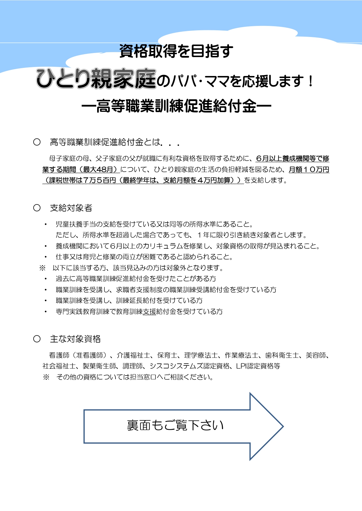 沖縄県では、県内町村在住の母子家庭の母または父子家庭の父で、看護師や保育士などの資格取得を目指すために1年以上養成機関へ修業している方を対象に、生活の負担の軽減を図るため、高等職業訓練促進給付金を支給します。