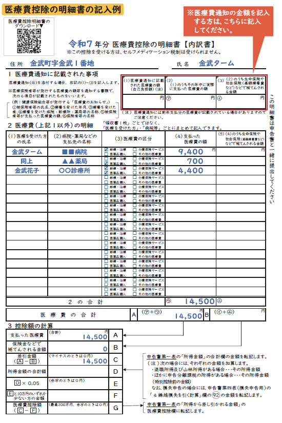 医療費控除の適用を受けたい場合は、医療費の領収書や医療費通知をもとに、「医療を受けた人」ごと、「病院、薬局」ごとに金額を計算してきてください。また、「医療費控除の明細書」の事前作成をお願いします。(医療費控除の明細書は国税庁ホームページからダウンロードできます)